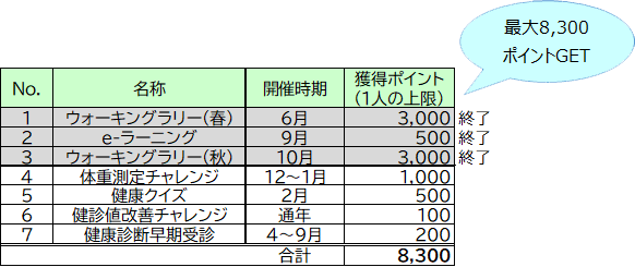 個人にプラスしてポイント付与平均8,000歩以上 972名(1,500ポイント) 平均4,000~7,999歩 721名(1,000ポイント) 平均2,000~3,999歩 59名(500ポイント) 平均0~1,999歩 897名(0ポイント) - その他イベント情報