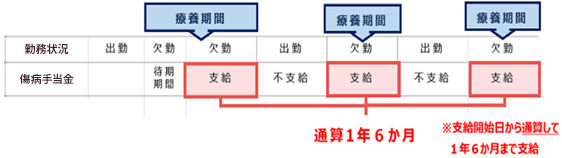 同じ傷病での支給期間は、支給開始日から1年6ヶ月分(通算)となります。